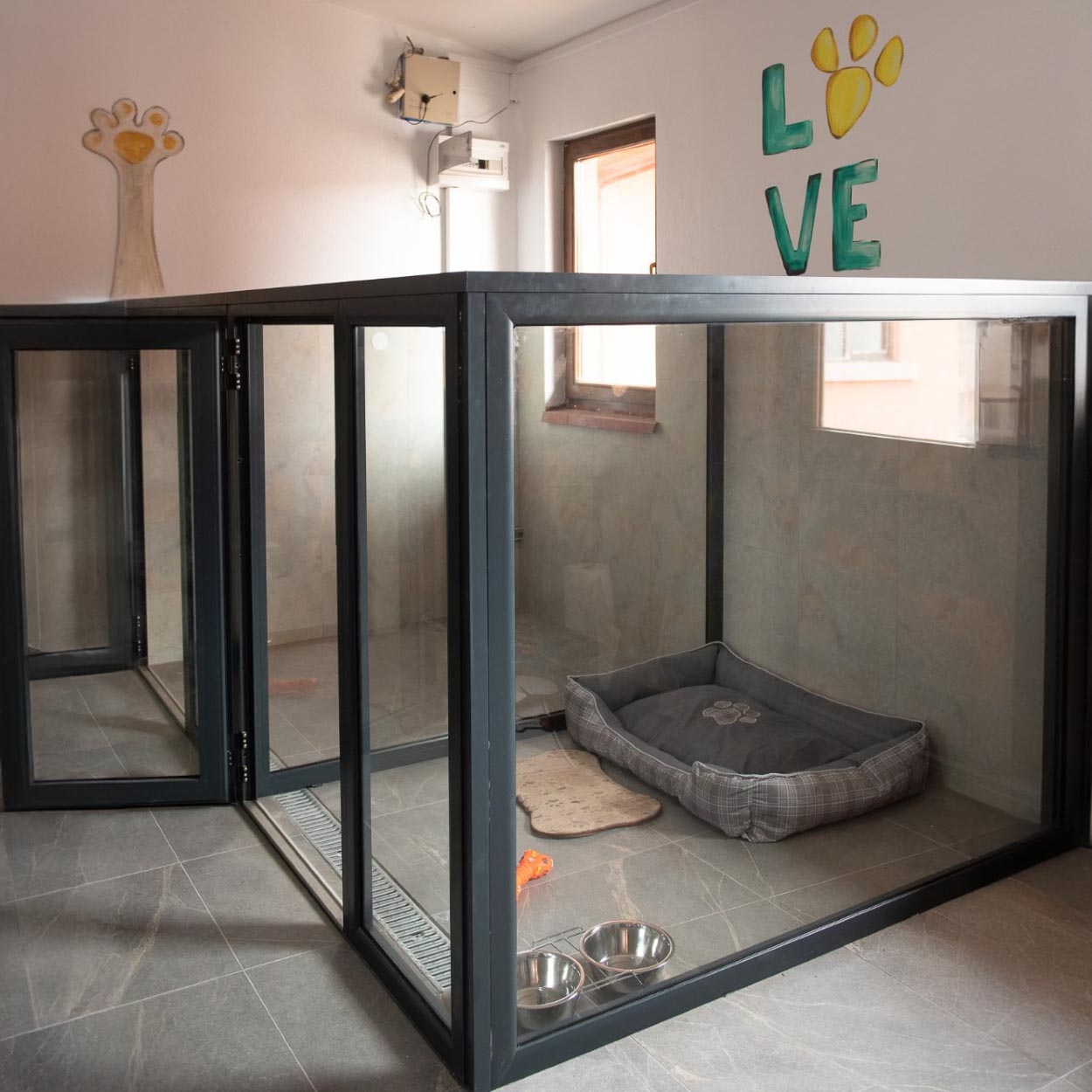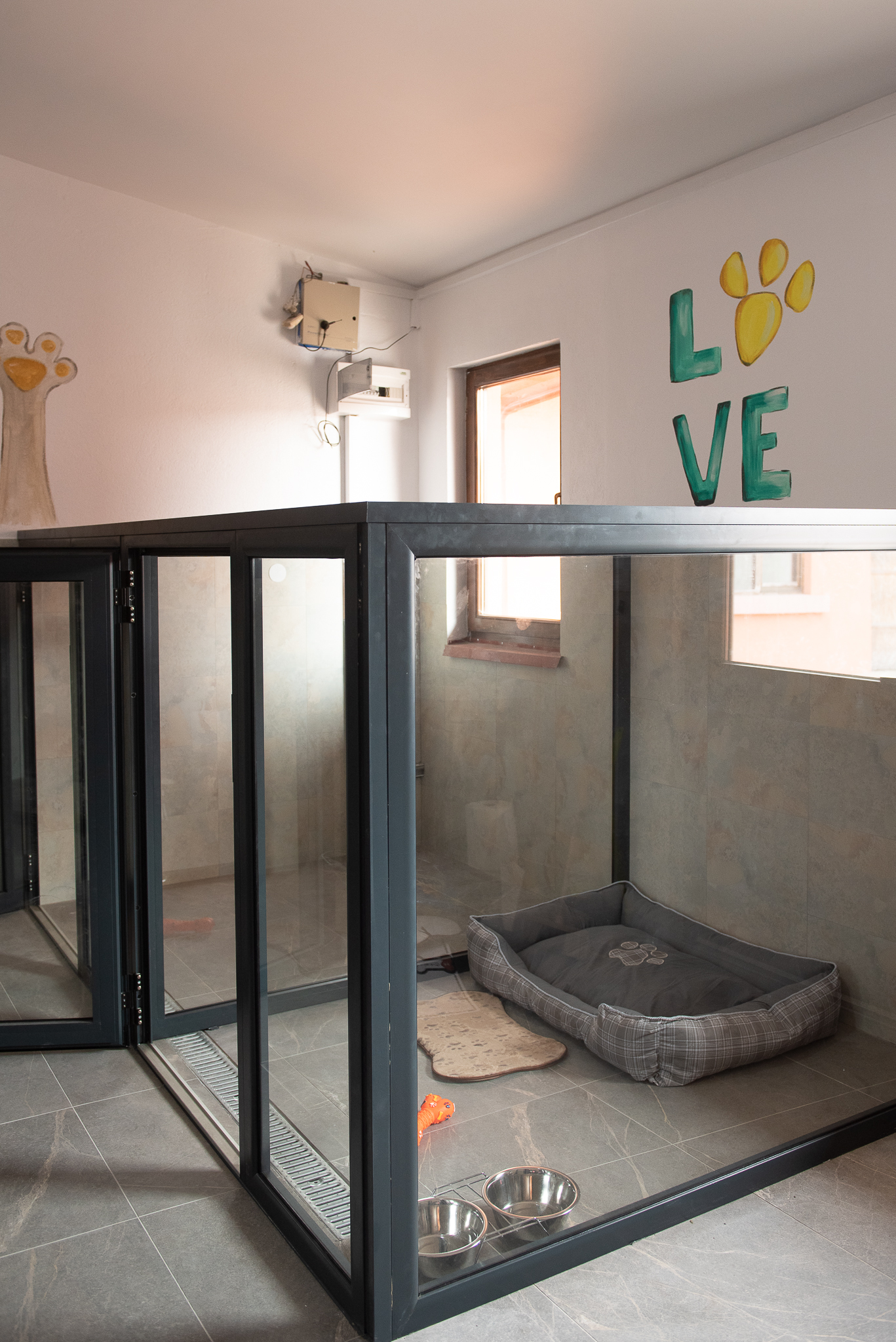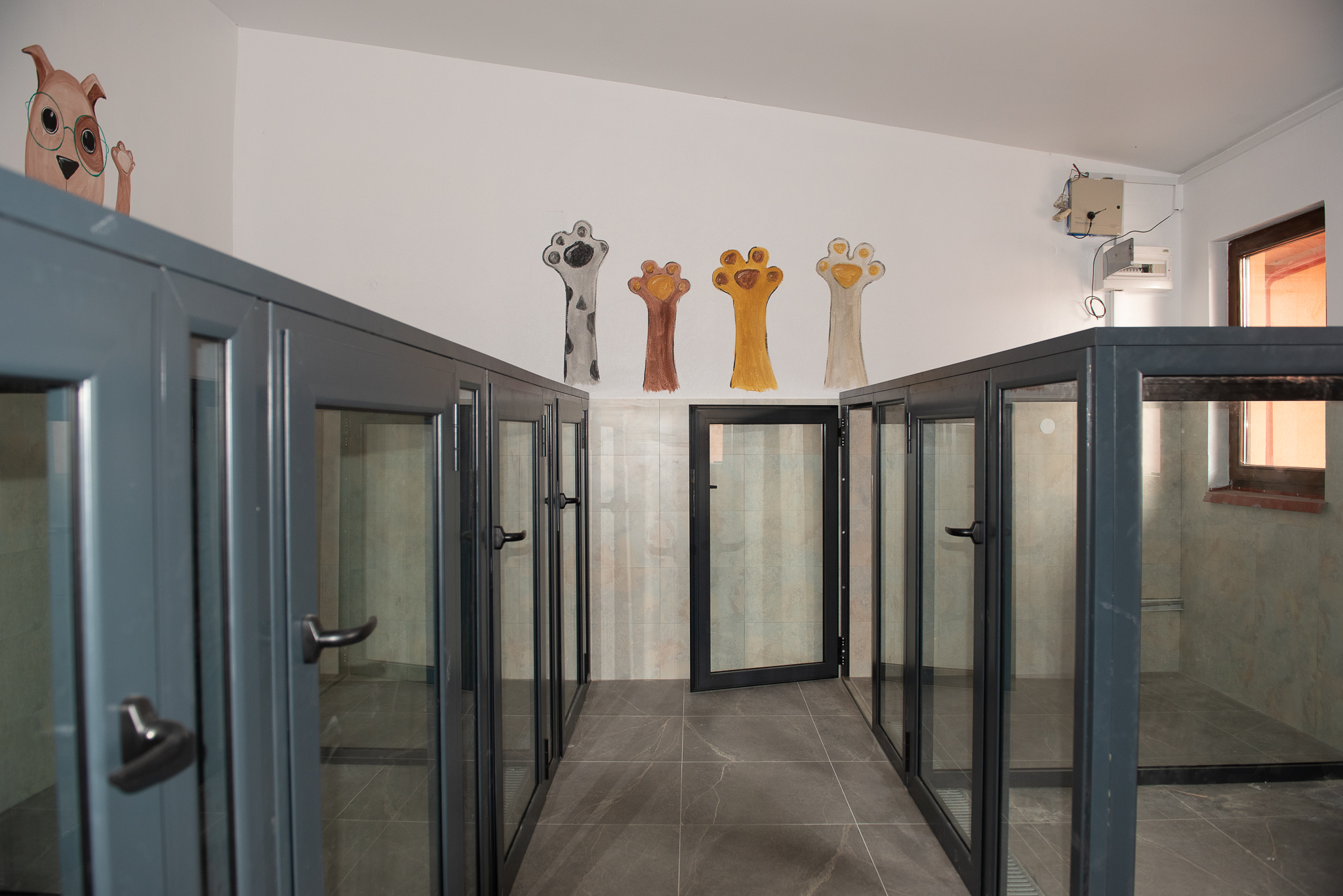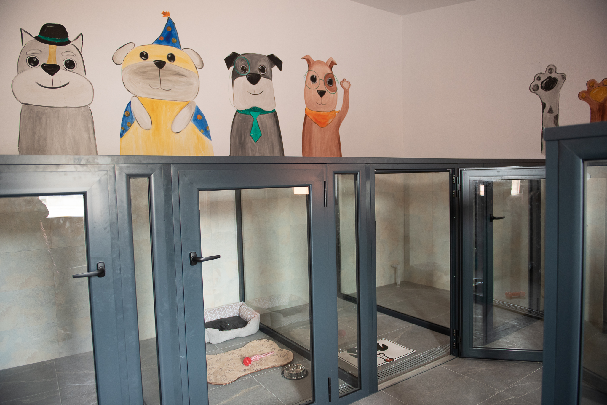 Camerele hotelului pentru câini sunt dotate cu sisteme de încălzire și ventilație, asigurând confortul optim pe tot parcursul anului. Fiecare câine beneficiază de un spațiu individual, delimitat de pereți de sticlă, care permite vizibilitatea între câini, fără riscul de a se răni.